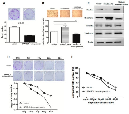 Cells were lysed directly in a modified RIPA buffer containing a protease inhibitor mixture (Roche, Basel, Switzerland). The relative protein concentration in the supernatants was related to standard BSA concentrations determined by BCA protein assay kit (Thermo Fisher Scientific, Waltham, MA, USA). For each lane of 8~10% SDS–PAGE gel, 40 ug protein of cell lysates were loaded, separated and subsequently transferred onto Immobilon-P Transfer Membrane (Millipore, Burlington, MA, USA). The membranes were probed with specific antibodies. The primary antibodies were against SPARCL1 (Abcam, Cambridge, MA, UK), Vimentin (Cell Signaling Technology, Danvers, MA, USA), N-cadherin (Cell Signaling Technology, Danvers, MA, USA), E-cadherin (Cell Signaling Technology, Danvers, MA, USA), β-actin (Chemicon, Temecula, CA) and GAPDH (GeneTex, Irvine, CA, USA). The primary antibodies were used: SPARCL1 (1:500), Vimentin (1:1000), N-cadherin (1:1000), E-cadherin (1:1000), β-actin (1:5000) and GAPDH (1:5000). The secondary antibodies were added and incubated for 2 h and then visualized using chemiluminescence. Enhanced chemiluminescence (ECL) western blotting reagents were obtained from Pierce Biotechnology (Rockford, IL, USA).