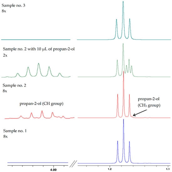 On the green spectrum (sample no. 2), it can be seen that signals from propan-2-ol increased after the addition of 10 μL of the standard. Moreover, in the case of sample no. 2, in which propan-2-ol was detected, no signals from acetone were observed at 2.21 ppm (in the red spectrum) (Figure 2). This suggests that it may be formed from acetone. In the case of sample no. 1 (distillate obtained from mash inoculated with S. cerevisiae yeast), a signal was observed from acetone (Figure 2, in the blue spectrum), but not from propan-2-ol (Figure 1, in the blue spectrum). The concentration of propan-2-ol may have been below the level of detection. Analogous results to those for sample no. 1 were obtained for sample no. 3 (distillate obtained from mash inoculated with yeast and mixed culture of LAB) (Figure 1 and Figure 2).