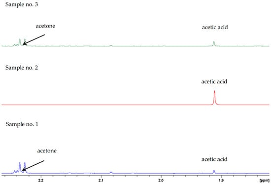 1H NMR spectra in the chemical shift region associated with acetone and acetic acid signals. (Sample no. 1—distillate obtained from mash inoculated with yeast; Sample no. 2—distillate obtained from mash inoculated with LAB; Sample no. 3—distillate obtained from mash inoculated with yeast and LAB).