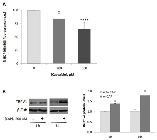 We first analyzed whether capsaicin modifies neutral lipid accumulation in HepG2 cells. To this aim, cells were first serum-starved for 24 h and then incubated with capsaicin for 24 h. The intracellular neutral lipid content was measured by staining cell lipid droplets with BODIPY 493/503 for 30 min. As shown in Figure 1A, doses of 200 µM and 300 µM capsaicin decreased neutral lipid content in HepG2 cells by 20% and 40%, respectively. The dose of 200 µM capsaicin was then chosen to continue the study as it was the lowest dose that produces the effect. We next evaluated endogenous expression of TRPV1, as capsaicin is an agonist of this channel []. As shown in Figure 1B, HepG2 cells express endogenous TRPV1 protein and capsaicin induced an increase in its expression as earlier as 1 h after treatment, with a greater effect at 8 h of treatment. Likewise, capsaicin inhibited neutral lipid accumulation and upregulated TRPV1 expression in HepG2 cells exposed to oleic acid (Supplemental Figure S1). These results indicate that TRPV1 expression is important for the capsaicin action in HepG2 cells. A similar capsaicin effect has been observed in mice epididymal and subcutaneous pre-adipocytes, in which dietary capsaicin counteracted the suppressive effect of a high fat diet on TRPV1 expression [].