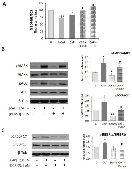 AMPK is involved in the capsaicin-induced reduction of neutral lipid content in HepG2 cells. HepG2 cells were cultured in EMEM medium without serum for 24 h. (A) Capsaicin reduces neutral lipid content through CaMKKII/AMPK activation. Cells were pretreated with vehicle, 5 µM dorsomorphin (DORSO) or 10 µM STO-609 (STO) for 30 min and then treated with or without 1 µM AICAR or 200 µM capsaicin (CAP) for 24 h. Intracellular neutral lipids were stained with bodipy 493/503 (BDP 493/503) for 30 min and fluorescence was measured by flow cytometry to quantify neutral lipid content. The fluorescence intensity of untreated cells (0) was used as the control and the rest of values were expressed as % of the control value. Results are the mean ± SEM of four experiments. Statistical significance was determined by one-way ANOVA and Tukey’s multiple comparisons test. (B,C) Capsaicin activates AMPK. Cells were pretreated with vehicle or 5 µM DORSO, and then treated with or without 200 µM CAP for 1 h. The levels of pAMPK, pACC, pSREBP and their corresponding not phosphorylated forms were determined by immunoblotting. β-tubulin was used as a loading control. The densitometric analysis of the bands is shown on the right. Data are the mean ± SEM of four experiments. Statistical significance was determined by two-way ANOVA and Dunnett’s multiple comparisons test. Comparisons were vs untreated cells (* p < 0.05, ** p < 0.01, *** p < 0.005) or capsaicin treated cells (# p < 0.05).