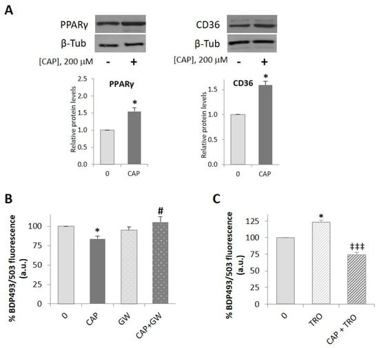 PPARγ is involved in the capsaicin-induced reduction of neutral lipid content in HepG2 cells. HepG2 cells were cultured in EMEM medium without serum for 24 h. (A) Capsaicin upregulated PPARγ and CD36 protein expression. Cells were pretreated with vehicle or 3µM of GW9662(GW) for 30 min and then treated with or without 200 µM capsaicin for 8 h. Levels of PPARγ and CD36 were determined by immunoblotting. β-tubulin was used as a loading control. The densitometric analysis of the bands is shown under the blots. Results are the mean ± SEM of three experiments. Statistical significance was determined by the Student’s t test. (B) Capsaicin reduced basal neutral lipid content in HepG2 cells. Cells were pretreated with vehicle or 3 µM of GW9662 for 30 min and then treated with or without 200 µM capsaicin (CAP) for 24 h. (C) Capsaicin inhibited troglitazone-induced neutral lipid accumulation in HepG2 cells. Cells were pretreated with vehicle or 10 µM of troglitazone (TRO) for 30 min and then treated with or without 200 µM capsaicin (CAP) for 24 h. Intracellular neutral lipids were stained with bodipy 493/503 (BDP 493/503) for 30 min and fluorescence was measured by flow cytometry to quantify neutral lipid content. The fluorescence intensity of untreated cells (0) was used as the control and the rest of values were expressed as % of the control value. Results are the mean ± SEM of four experiments. Statistical significance was determined by one-way ANOVA and Tukey’s multiple comparisons test. Comparisons were vs. control (* p < 0.05), capsaicin-treated cells (# p < 0.05), or troglitazone-treated cells (‡‡‡ p < 0.005).