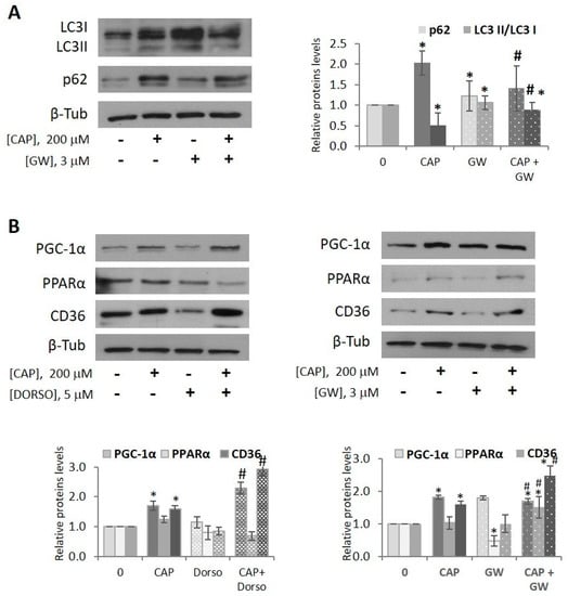 Interestingly, specific adipose tissue from autophagy-deficient mice showed increased levels of brown adipogenic factor PPAR-γ transcriptional coactivator (PGC-1 α) and higher adipose tissue β-oxidation rates []. Thus, we assessed whether capsaicin regulated PGC-1α in HepG2-cells. As shown in Figure 4B, capsaicin significantly upregulated the expression of this coactivator, pointing to capsaicin activation of the PGC-1α-PPARα axis. We also assessed the expression of CD36, which is reported to be activated by PPAR ligands in a PPAR subtype- and tissue-specific manner [,]. We show that capsaicin increased CD36 protein levels, which is in line within PGC-1α-PPARα axis activation. Neither dorsomorphin nor GW9662 prevented capsaicin-induced PGC-1α nor CD36 increase, which suggests that capsaicin upregulates them through an AMPK- and PPARγ- independent mechanism. We then evaluated PPARα expression in HepG2 cells. As shown in Figure 4B, PPARα is expressed in HepG2 cells and capsaicin in combination with GW9662 resulted in PPARα upregulation. These data are consistent with the notion that capsaicin may also decrease neutral lipid content by activating fatty acid transport and oxidation through PGC-1α-PPARα axis upregulation.
