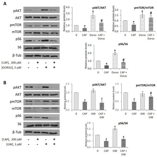 Capsaicin inhibits the AKT/mTORC1 pathway in HepG2 cells. HepG2 cells were cultured in EMEM medium without serum for 24 h. (A) Cells were pretreated with vehicle or 5 µM dorsomorphin (DORSO) for 30 min and treated with or without 200 µM CAP for 1 h. Cells were lysed and levels of pAKT (Ser473), pmTOR (Ser2448), pS6 (Thr389) and their corresponding total proteins were determined by immunoblotting. β-tubulin serves as a loading control. The densitometric analysis of the bands is shown on the right. (B) Cells were pretreated with vehicle or 3 µM GW9662 (GW) for 30 min and treated with or without 200 µM CAP for 1 h. Cells were lysed and the levels of pAKT (Ser473), pmTOR (Ser2448), pS6 (Thr389) and their corresponding total proteins content were determined by immunoblotting. Data are the mean ± SEM of three experiments. Statistical significance was determined by two-way ANOVA and Dunnett’s multiple comparisons test. Comparisons were vs untreated cells (* p < 0.05) or capsaicin-treated cells (# p < 0.05).