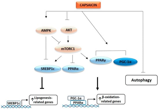 Obesity is a major risk factor for metabolic diseases and represents a serious primary health problem worldwide []. Overfeeding and a sedentary life style are major contributors of this disorder. Hence, dietary habits are of special interest to prevent and counteract obesity and its associated metabolic complications. Accumulating evidence has shown that dietary capsaicin displays anti-obesity activity by targeting different organs and tissues in the whole body, thus counteracting obesity and the related metabolic disorders such as insulin resistance and liver steatosis []. In this study, we evaluated the impact of capsaicin on hepatic lipid accumulation and delineated the cellular signaling pathways involved. We show that capsaicin reduces the neutral lipid content in HepG2 cells through AMPK and PPARγ activation, and increases TRPV1, PPARγ and CD36 protein levels. Furthermore, capsaicin inhibits the AKT/mTOR pathway and SREBP-1c, pointing to lipogenesis inhibition. In addition, capsaicin blocks autophagy and increases PGC-1α protein levels, pointing to activation of the PGC-1α-PPARα axis and fatty acid oxidation in HepG2 cells.