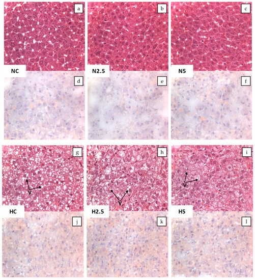 Considering the anatomical and pathological examination (Figure 1), the presence of steatosis in rats of the H groups can be observed in both the macroscopic and microscopic images. Macroscopically, the liver was enlarged, yellow, and greasy (pictures not shown). Microscopically, the hepatocytes contained small and large vesicles due to the abnormal accumulation of lipids, particularly triglycerides. The accumulation of fat was confirmed using Sudan III, which stains triglycerides and other intracellular lipid droplets, providing an orange color. According to the number of vacuoles, the steatosis was classified as grade 3, with 50–75% of the hepatocytes showing vacuolar degeneration. However, after the consumption of spinach (H2.5 and H5 rats), the vacuoles were slightly smaller in comparison with those of animals that had received the high fat diet.