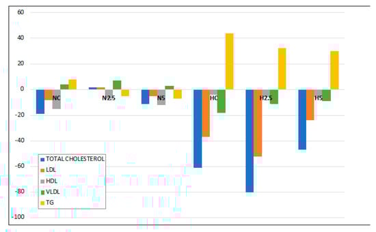 Regarding the plasma lipid levels, Figure 2 represents the changes between initial and final values. No significant changes were observed for total cholesterol, low-density lipoprotein (LDL), high-density lipoprotein (HDL), VLDL, or triglycerides (TG) in groups NC, N2.5, and N5 during the intervention period. In contrast, important changes were observed between the initial and final parameters for the H groups, showing a significant drop in total cholesterol, LDL and VLDL and a significant increase in plasmatic TG (Figure 2). This trend was due to the steatosis, since the metabolism of lipoprotein is altered, significantly increasing the content of plasmatic TG. The consumption of spinach only leads to a significant reduction in final cholesterol (108 in HC, 91 in H2.5 and 75 in H5), and triglycerides (123 in HC, 102 in H2.5 and 103 in H5), showing a hipocholestrelomic effect (data not shown). Other parameters measured were the inflammation and oxidative stress biomarkers. For oxygen radical absorption capacity (ORAC) in plasma and for urinary isoprostanes, there were no significant differences between the initial (data not shown) and final values or among the different conditions (diet and spinach supplementation, Table 3). The levels of adiponectin and TNF-α did not change either; no significant difference was found according to the diet or the consumption of spinach.
