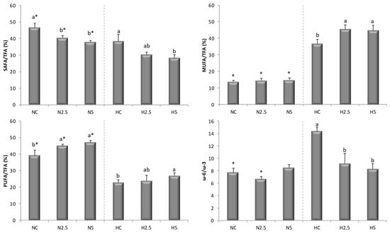 Saturated fatty acid (SAFA)/total fatty acid (TFA), monounsaturated fatty acid (MUFA)/TFA, polyunsaturated fatty acid (PUFA)/TFA, and ω-6/ω-3 ratios in the liver of rats of the six experimental groups. a,b Different letters show significant statistical differences (p < 0.05) among groups fed the standard diet (NC, N2.5, N5) or the high-fat diet (HC, H2.5, H5) after performing a one-way ANOVA. * Significant statistical difference (p < 0.05), after carrying out a two-sample t test, between the members of the NC-HC, N2.5-H2.5, and N5-H5 pairings. Result are expressed as mean ± SD.