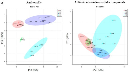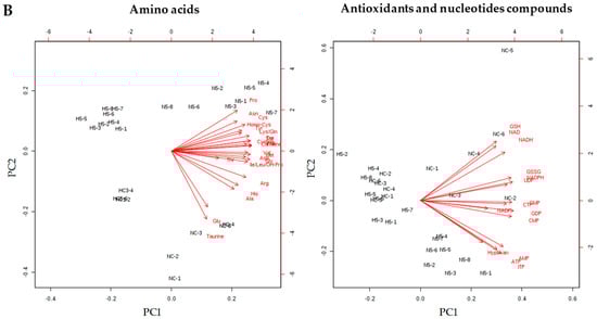 (A) PCA scores and (B) eigenvector plots for the amino acids, antioxidants, and nucleotides compounds, according to the metabolites found to differ significantly (ANOVA p < 0.05) among the different diets: group NC: standard diet, N5: standard diet + 5% spinach, HC: high fat diet and H5: high fat diet + 5% spinach. Confidence regions are marked with different ellipses.