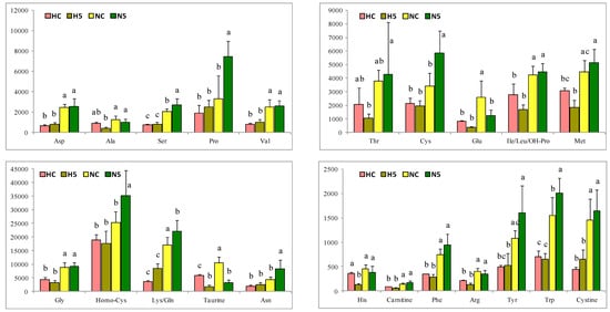 Amino acid content in the liver of rats of the four experimental groups (HC: high fat diet, H5: high fat diet + 5% spinach, NC: standard diet and N5: standard diet + 5% spinach). The bar height indicates the mean value of each feed condition and the error bar indicates the standard deviation. a–c Different letters indicate significant statistical differences (p < 0.05).