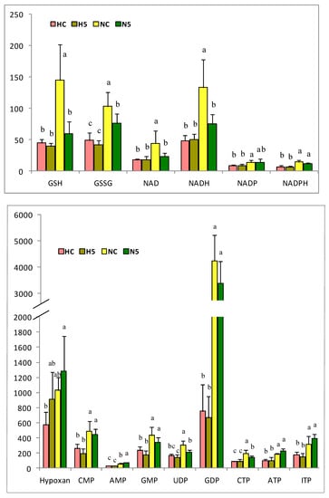 Antioxidant and nucleotide compounds in the liver of rats of the four experimental groups (HC: high fat diet, H5: high fat diet + 5% spinach, NC: standard diet and N5: standard diet + 5% spinach). The bar height indicates the mean value of each feed condition and the error bar indicates the standard deviation. a–c Different letters indicate significant statistical differences (p < 0.05). GSH: l-glutathione; GSSG: l-glutathione oxidized form; NAD: nicotinamide adenine dinucleotide; NADH: nicotinamide adenine dinucleotide reduced form; NADP: nicotinamide adenine dinucleotide phosphate; NADPH: nicotinamide adenine dinucleotide phosphate reduced form; CMP: cytidine monophosphate; AMP: adenosine monophosphate; GMP: guanosine monophosphate; UDP: uridine diphosphate; GDO: guanosine diphosphate; CTP: cytidine triphosphate; ATP: adenosine triphosphate; ITP: inosine triphosphate.