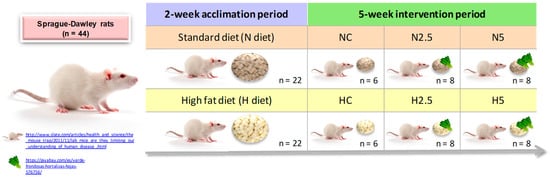 where n is the number of subjects without attrition and R is the expected proportion of attrition. Forty-four male adult Sprague-awley rats (8 weeks of age) were grouped into two groups (n = 22) according to their diet: standard diet (diet N) or a high-fat diet (diet H). These diets were administered for two weeks; after this time, the animals were classified into six experimental groups. There were two control groups (n = 6 rats/group), a standard diet (NC) and a high fat diet (HC), and four experimental groups (n = 8 rats/group): N5 (standard diet + 5% spinach), N2.5 (standard diet + 2.5% spinach), H5 (high fat diet + 5% spinach), and H2.5 (high fat diet + 2.5% spinach). The experimental period was five weeks (Figure 7). Body weight was registered weekly and feed intake and urinary and fecal excretions were recorded in the initial, middle, and final parts of the experimental period, using metabolic cages for data collection. At the end of this period, the rats were sacrificed and the different biological samples (plasma, feces, urine, and liver) were obtained. All the samples were stored at −80 °C until the analytical processes were performed.