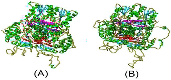 Predicted tertiary structures of AtDXS and PtDXS Green, cyan, and yellow, α-helices, β-strands, and random coils, respectively. Red and magenta, TPP and DRAG domain motifs, respectively. (A) Tertiary structure of AtDXS; (B) Tertiary structure of PtDXS.
