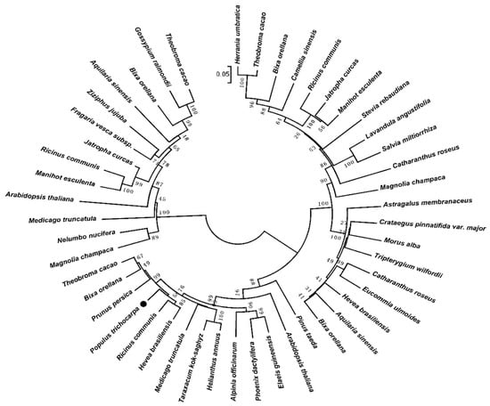 Phylogenetic tree of Populus trichocarpa. Amino acid sequences of PtDXS (XP_024463484.1) and other DXS proteins. The tree was constructed using the neighbor-joining method in MEGA 5.1 and was bootstrapped 1000 times. Bootstrap percentages are indicated at the branch points. In all cases, the tree topologies obtained using the neighbor-joining, minimum-evolution, and maximum-parsimony methods were identical. The GenBank accession numbers of the DXS sequences are as follows: Alpinia officinarum (AEK69518.1), Medicago truncatula (CAD22530.1), Pinus taeda (ACJ67021.1), Catharanthus roseus (ABI35993.1), Jatropha curcas (XP_012076628.1), Fragaria vesca subsp. Vesca (XP_011459218.1), Colwellia psychrerythraea (KGJ90592.1), Hevea brasiliensis (ABD92702.1), Bixa orellana (AMJ39459.1), Elaeis guineensis (XP_019710182.1), Helianthus annuus (OTG31837.1), Phoenix dactylifera (XP_008795130.1), Prunus persica (XP_007225144.1), Ricinus communis (XP_015573388.1), Taraxacum kok-saghyz (AMB19705.1), Theobroma cacao (XP_017975597.1), Aquilaria sinensis (AHI62962.1), Astragalus membranaceus (AID51428.1), Bixa orellana (AMJ39460.1), Catharanthus roseus (CAA09804.2), Crataegus pinnatifida var. Major (ALL29183.1), Eucommia ulmoides (AFU93069.1), Hevea brasiliensis (BAF98289.1), Morus alba (ALD62471.1), Tripterygium wilfordii (AKP20998.1), Arabidopsis thaliana (OAP04569.1), Bixa orellana (AMJ39461.1), Camellia sinensis (ANB66336.1), Herrania umbratica (XP_021276650.1), Jatropha curcas (XP_012065282.1), Lavandula angustifolia (AGQ04154.1), Magnolia champaca (ART66976.1), Manihot esculenta (XP_021634514.1), Ricinus communis (XP_002533688.1), Salvia miltiorrhiza (ACQ66107.1), Stevia rebaudiana (ALJ30087.1), Theobroma cacao (XP_017981933.1), Aquilaria sinensis (AFU75320.1), Arabidopsis thaliana (NP_196699.1), Bixa orellana (AMJ39462.1), Gossypium raimondii (XP_012474408.1), Jatropha curcas (XP_012076626.1), Magnolia champaca (ART66977.1), Manihot esculenta (XP_021597449.1), Medicago truncatula (XP_003603440.1), Nelumbo nucifera (XP_010254310.1), Ricinus communis (XP_002514364.1), Theobroma cacao (EOY31423.1), and Ziziphus jujuba (XP_015885917.1).