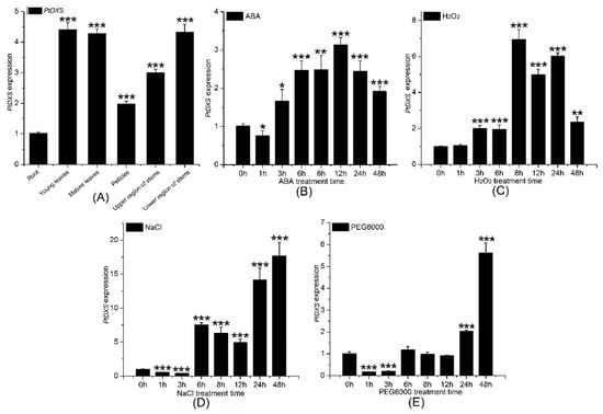 Comparison of PtDXS expression in various tissues and in response to stresses. (A) Comparison of the PtDXS expression in the indicated tissues. Comparison of the PtDXS expression level in young leaves followed by different treatments and times (B) 200 μM ABA, (C) 2 mM H2O2, (D) 200 mM NaCl, and (E) 10% PEG6000. All experiments have been normalized by βactin as an internal reference; bars represent means ± standard deviation (SD; n = 3); three independent biological experiments were performed with three repeats; asterisks represent significant differences in comparing with 0 h treatment as the control (Student’s t-test; *, **, and ***, p < 0.05, p < 0.01, and p < 0.001, respectively).