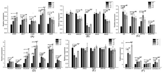 Changes in the expression levels of MVA- and MEP-related genes may affect those of ABA- and GA-related genes. The expression levels of NCED1, NCED5, NCED6, ZEP1, ZEP2, and ZEP3 were significantly higher in the transgenic plants, but that of NCED3 was lower (Figure 5D). The expression levels of GA20OX-1, GA20OX-2, GA20OX-3, and GA20OX-4 were significantly higher in the transgenic plants (Figure 5F). In addition, while IAA1 gene revealed significant lower expression in transgenic poplars, IAA2, IAA6, IAA18, and IAA19 genes revealed no significant differences between transgenic and WT poplars (Figure 5E).