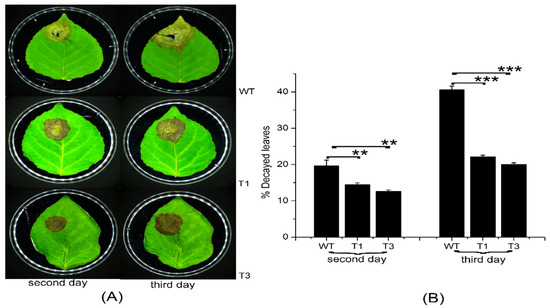 Necrotic symptoms of WT and transgenic plants infected with S. populiperda. (A) Leaves of WT and transgenic plants after inoculation. (B) Plaques on WT and transgenic plants. Three independent experiments were performed; three independent experiments were performed; asterisks represent significant differences relative to WT plants (Student’s t-test; **, and ***, p < 0.01, and p < 0.001, respectively).