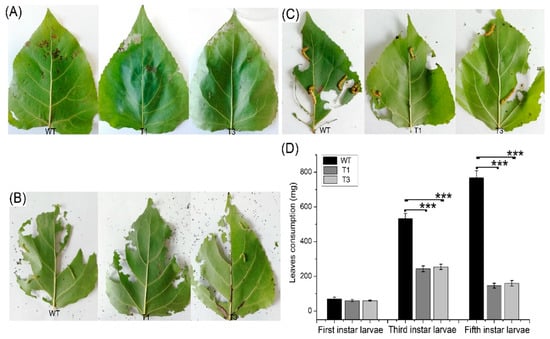 For the M. troglodyta feeding assay, we dipped the eggs of M. troglodyta in a brush and attached them to the back of the clean poplar leaves, then placed them in flask followed by incubation for cultivation. The temperature of incubator was 25–28 °C with one photoperiod as light/dark = 14h/10h. The same position of 2-years-old transgenic and WT poplar leaves were used to breed first-instar larvae, third-instar larvae, and fifth-instar larvae. The specific feeding process was carried out as follow: Leaves were collected, washed and dried. In addition, the poplar leaves were placed in flasks. Then, first-instar larvae, third-instar larvae, fifth-instar larvae were fed with transgenic and WT leaves separately, and the leaves were replaced once every 2 days. The fresh weight of the remaining leaves and the weight of the larvae were determined at least three times.