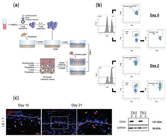 In vitro reconstructed skin models have been produced according to the self-assembly method, with some minor modifications [45]. Each reconstructed skin contains fibroblasts and keratinocytes of the same donor, and therefore of the same age and same sex. Briefly, 0.08 × 106 human dermal fibroblasts were seeded in 12-well plates, and cultured with ascorbic acid at a concentration of 50 mg/mL (Sigma-Aldrich, MO, USA). The dermal tissues were enabled to produce their own extracellular matrix for three weeks at 37 °C and 8% CO2. After this time frame, activated T cells (0.4 × 106 per sheet) were seeded on dermal fibroblast sheets for 1 more week, in presence of 30 U/mL recombinant human IL-2 (R&D Systems, MN, USA). Then, human keratinocytes (0.75 × 106) were seeded on the top of one dermal immunocompetent sheet, and cultured in DMEM-HAM with ascorbic acid and IL-2 submerged for 7 days, allowing the keratinocytes to proliferate. Two sheets were then stacked and raised at the air-liquid interface, allowing the cells to differentiate. Cell culture media were changed three times a week. Cell culture supernatants were taken at day 10 and day 21 during the air-liquid culture. Healthy and lesional skin models without activated T cells served as controls.