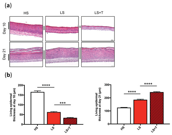 To study the effect of T cell-addition on epidermal morphogenesis, we compared the thickness of the different tissues on day 10 and 21 of the air-liquid culture, as tissue culture during 21 days in air-liquid promotes and ensures a full differentiation and stratification of the epidermis. The thickness of lesional (LS) living epidermis was significantly lower than that of healthy skin (HS) at day 10 (LS: 63 ± 3µm, HS: 166 ± 6µm, p < 0.0001). However, the opposite was observed at day 21, where the LS epidermis was significantly thicker (LS: 186 ± 4µm, HS: 126 ± 1µm, p < 0.0001) (Figure 2a,b). In fact, while HS reached maximum thickness at day 10, the LS tripled the thickness of their epidermis between day 10 and day 21. Thus, the in vitro epidermal differentiation of LS was delayed compared to that of HS (Figure 2a,b). Interestingly, although the infiltration of activated T cells significantly reduced the thickness of LS at day 10 (LS: 63 ± 3 µm, LS + T: 34 ± 2 µm, p < 0.001), it drastically increased the thickness of LS at day 21 (LS: 186 ± 4 µm, LS + T cells: 244 ± 3 µm, p < 0.0001), suggesting hyperproliferation of lesional keratinocytes in the immunocompetent skin model, despite a delayed onset of epidermal differentiation (Figure 2a,b).