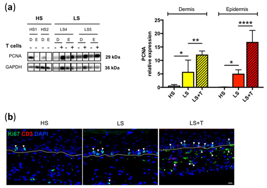 To deeper investigate whether activated T cells affect these cells’ proliferation of skin models, we analyzed the basal expression level of proliferating cell nuclear antigen (PCNA), a common marker for the visualization of DNA replication in living cells. Mechanical separations between the dermis and the epidermis were performed on the different skin models, with or without activated T cells. The relative expression of PCNA was higher in the dermal and epidermal compartment of LS compared to the HS, where its expression was decreased within the two skin compartments. The addition of T cells potentiated the proliferation within the dermal compartment of lesional skin models, and even more in the epidermal compartment of LS (Figure 3a). Immunofluorescence analysis of the expression of the proliferation marker Ki67 demonstrated that T cell-free lesional reconstructed tissues had a higher proliferation rate of basal keratinocytes than that observed in HS, in agreement with observations made in vivo [17].