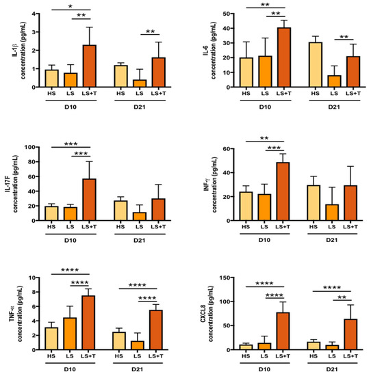 Increased secretion of proinflammatory factors generated by T cells in tissue-engineered lesional skin models. Analysis of protein expression of the culture supernatants of healthy (HS), lesional (LS), and lesional with T cells (LS + T) skin models at day 10 and 21 of the air-liquid culture. The values are presented as mean ± SD (n = 3). Significant differences (*p < 0.05, **p < 0.01, ***p < 0.001, ****p < 0.0001) are indicated by an asterisk.