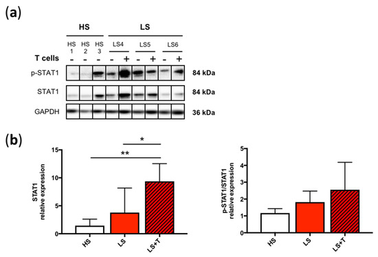 The baseline levels of STAT1 were not significantly different in HS, and LS models, although these levels tend to be increased in LS (Figure 5a,b). Activated T cells significantly increased the expression of STAT1 in lesional reconstructed tissues. Surprisingly, activation of STAT1, highlighted by the ratio p-STAT1/STAT1, was only slightly increased in LS + T. (Figure 5a,b). These results indicated that T cells are partly responsible for the activation of the STAT1 pathway.