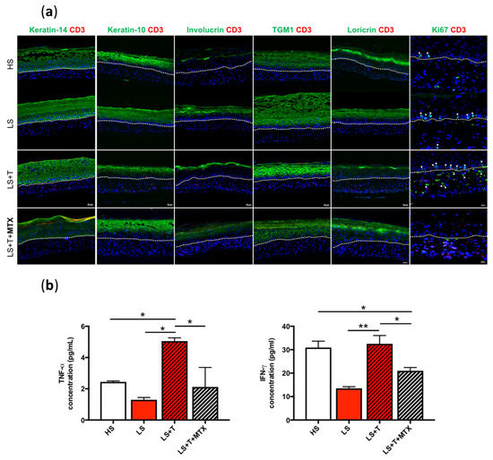 In addition, treatment with methotrexate reduced the proliferation of epidermal basal keratinocytes in LS + T (Figure 6a). The secretion of proinflammatory cytokines IFN-γ and TNF-α was significantly decreased following a 7-day treatment with methotrexate in LS + T, compared to untreated LS + T (Figure 6b).