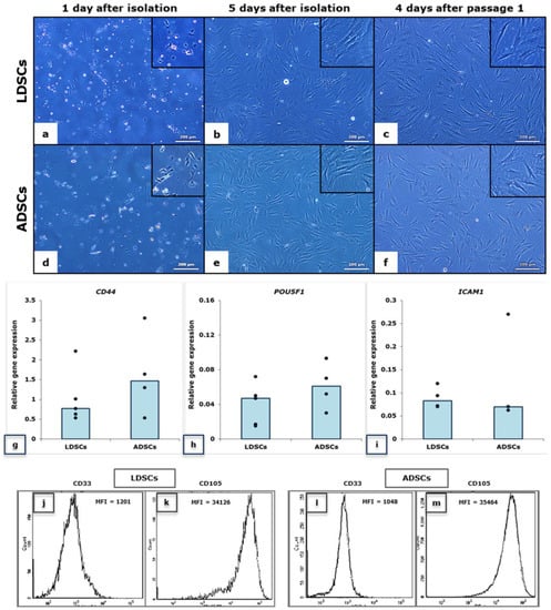 In Figure 1 the morphology of LDSCs (a–c) and ADSCs (d–f) is presented at three time points, 1 and 5 days after isolation and 4 days after passage 1. No significant differences were observed in morphology between LDSCs and ADSCs at those time points. Real-time polymerase chain reaction (PCR) analysis of CD44 and POU5F1 stem cell markers’ expression (Figure 1g,h) confirmed that both LDSCs and ADSCs express these genes at passage 2. Slightly higher expression of CD44 and POU5F1 in ADSCs compared to LDSCs was noticed, but was not statistically significant. Flow cytometric analysis (Figure 1j–m) revealed high expression of CD105, positive surface stem cell marker, in both LDSCs (Figure 1k) and ADSCs (Figure 1m) at passage 2, and poor expression of CD33, negative stem cell marker (Figure 1j,l). Both LDSCs and ADSCs express ICAM1 however, slightly higher expression, but not significantly higher, was noticed in LDSCs (Figure 1i).