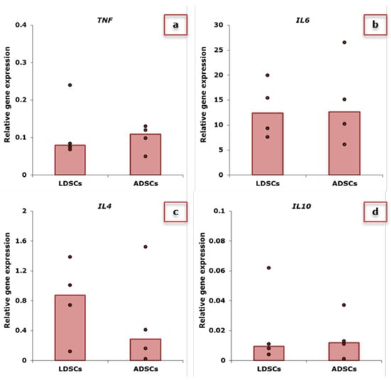 Relative expression of TNF (a), IL6 (b), IL4 (c) and IL10 (d) genes in LDSCs and ADSCs at passage 2, normalized to GAPDH; scatterplots with median; dots represent patients’-derived cultures per group, sample size: n(LDSCs) = 4 and n(ADSCs) = 4 for all genes.