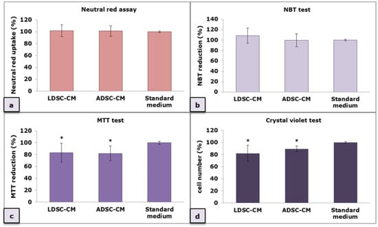 Macrophages’ response to LDSC-conditioned media (CM) and ADSC-CM evaluated by neutral red (NR) assay (a), NBT test (b), MTT test (c) and crystal violet (CV) test (d); mean ± standard deviation (SD); n(LDSCs) = 5 and n(ADSCs) = 4 (n − number of patients per group); for each patient sample culture-derived CM, as well as control culture, four to eight replicates were analyzed in each assay; (*) p < 0.05 (compared to standard medium).