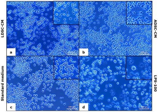 After 48 h of RAW 264.7 MΦs cultivation in LDSC-CM and ADSC-CM, changes in cell morphology were noticed (Figure 4). Unlike control culture (standard medium) where cells were predominantly small and round in shape (Figure 4c), LDSC-CM (Figure 4a) and ADSC-CM (Figure 4b) induced phenotypic changes toward larger, spread shapes with extensions. LPS-100 activated cells (Figure 4d) were epithelial in shape and full of vesicles.