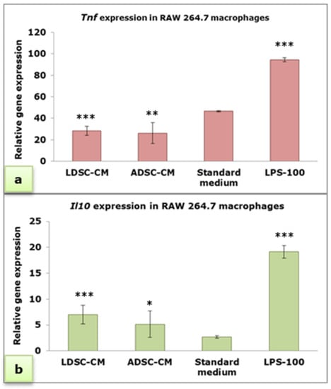 Relative expression of Tnf (a) and Il10 (b) genes in RAW 264.7 macrophages cultured for 48 h in LDSC-CM, ADSC-CM, standard medium and LPS-100, normalized to Actb; mean ± standard deviation (SD); n(LDSCs) = 4 and n(ADSCs) = 4 (n − number of patients per group); for each patient sample culture-derived CM, as well as controls, four replicates were analyzed; (*) p < 0.05, (**) p < 0.01, (***) p < 0.001 (compared to standard medium).