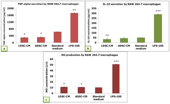 TNF-alpha (a), IL-10 (b) and NO concentration (c) in cell culture supernatant of RAW 264.7 macrophages cultured for 48 h in LDSC-CM, ADSC-CM, standard medium and LPS-100; mean ± standard deviation (SD); sample size: n(LDSCs) = 4 and n(ADSCs) = 4 (n − number of patients per group); for each patient sample culture-derived CM, as well as controls, four replicates were analyzed; (*) p < 0.05, (**) p < 0.01, (***) p < 0.001 (compared to standard medium).