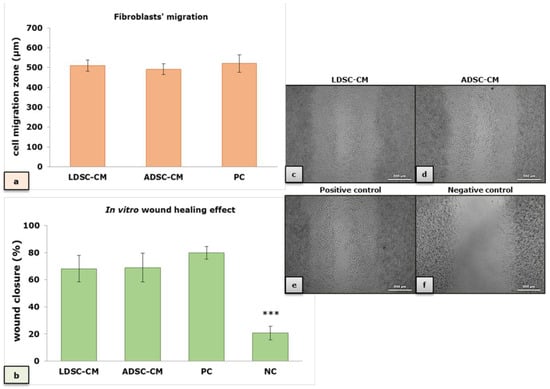 In vitro wound healing effect of conditioned media of LDSCs and ADSCs; effect of LDSC-CM, ADSC-CM, positive (PC) and negative (NC) control on fibroblasts’ migration (a) and wound closure (b); mean ± standard deviation (SD); sample size: n(LDSCs) = 4 and n(ADSCs) = 4 (n − number of patients per group); for each patient sample-derived CM, as well as controls, four replicates were analyzed; microscopic appearance of the “wound” 3 days after cultivation in LDSC-CM (c), ADSC-CM (d), positive control (e) and negative control (f); phase contrast with objective magnification 5×; (***) p < 0.001 compared to LDSC-CM, ADSC-CM and PC, no significant difference observed between both CM types and PC.