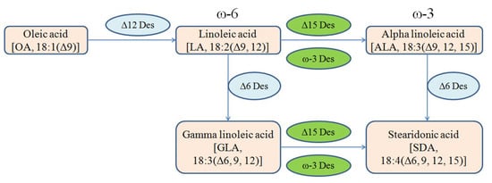 Stearidonic acid (SDA; 18:4, n-3) is produced from gamma linolenic acid (GLA; 18:3, n-6) and ALA (18:3, n-3) catalyzed by the enzymes delta 15-desaturase and delta 6-desaturase, respectively (Figure 1) []. SDA can be elongated to a longer chain omega-3 PUFA with related biological properties, such as EPA and docosahexaenoic acid (DHA) []. However, conversion of SDA from ALA is very inefficient in humans because delta 6-desaturase is rate-limiting, therefore it is difficult to change tissue levels of EPA (20:5, n-3) by the consumption of ALA. Consequently, the oral administration of SDA has been suggested as an alternative approach of increasing the amount of EPA in body tissues [,]. Again, in comparison to EPA and DHA, SDA is less unsaturated, more stable, less prone to oxidation, and therefore more amenable to a wide variety of food and beverage applications [].