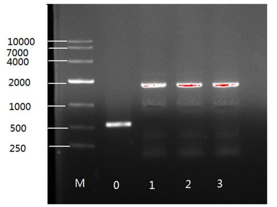 PCR amplification of genome of control and recombinant strains. Band 0 representing the control strain and 1,2,3 showing the recombinant strains.