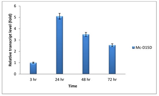 The accumulation of very-long-chain polyunsaturated fatty acid (VLCPUFA) in recombinant microorganisms is a process which can further improve the accumulation of desired products []. The oleaginous fungus, M. circinelloides, is an attractive oleaginous fungus for researchers because of its ability to produce oil that is rich in gamma linolenic acid. On the other hand, M. alpina produces both ARA and EPA and possess both ω-6 and ω-3 biosynthetic pathways for the production of fatty acids. However, in all other features, both fungi share similar characteristics and phenotype (filamentous) []. Delta-15 desaturase (ω-3 desaturase) of M. alpina ATCC 32221, is reported to convert GLA to SDA and LA to ALA. ALA is converted to SDA by delta-6 desaturase, which is already present in M. circinelloides []. Therefore, SDA can be produced using both pathways that were constructed in this fungus by overexpressing D15D gene (Figure 1). Besides the production of SDA, a significant amount of ALA was also produced in this process. The RT-qPCR results revealed that D15D mRNA remained elevated during the entire culture time of Mc-D15D and fatty acid analysis revealed the presence of SDA. These results confirmed that D15D was overexpressed in the recombinant strains.