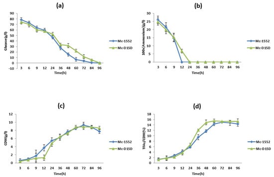 The effect of the D15D over-expression in growth and lipid accumulation was analyzed in the strain Mc-D15D, as shown in Figure 4. The concentrations of ammonium and glucose in the culture medium are also highlighted in Figure 4. Adequate concentrations of glucose remained during the entire bioprocess (Figure 4a), however at approximately 24 h the ammonium was used up by Mc-D15D (Figure 4b). After 12 h of cultivation, cell dry weight (CDW) increased rapidly but slowed down after nitrogen depletion (Figure 4c). The fungus started to accumulate lipids immediately after nitrogen exhaustion from the culture medium. The total fatty acids (TFAs) content increased rapidly from 24 h, reaching its peak at 60 h and then slowed gradually. The maximum content of TFAs was found to be 15.53% in Mc-D15D (Figure 4d).