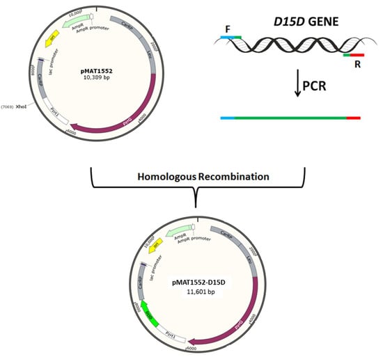 D15D-overexpressing plasmid for pleu-MU402 was constructed by using the expression vector pMAT1552, which contains the pyrG gene of M. circinelloides to encode orotidine 5′-phosphate decarboxylase to produce uridine as a selectable marker. It is surrounded up-stream and down-stream by 1 kb of carB-carRP sequences to allow its chromosomal integration by homologous recombination. PCR amplification was carried out to isolate the D15D gene from the genome of M. alpina ATCC 32222 using the primers D15D-F/R (Table S1). The 30 bp homologous sequences of both sides of XhoI restriction site in pMAT1552 were also included in these primers. After digestion with XhoI restriction endonuclease, the PCR fragment was ligated to generate plasmid pMAT1552-D15D (Figure 5) for mutant pleu-MU402. The recombinant plasmid was transformed into E. coli Top 10 competent cells for its propagation. The extracted plasmids from these bacteria were checked by PCR analysis and DNA sequencing was carried out to confirm the gene sequence.