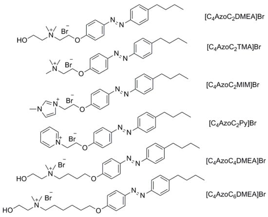 The azobenzene-based IL surfactants were prepared and purified by using the procedures described in our previous work []. The chemical structures of them were confirmed by 1H NMR, and their purity was found to be greater than 97% in mass fraction. The 1H NMR spectrum and detailed spectral data are shown in Figures S1–S6 in Supplementary Materials. The melting point of them have been determined by a Netzsch 204F1 DSC, and the results were shown in Table S2 in the Supplementary Information.