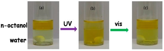 The use of light as an external stimulus for stimuli-responsive phase transfer is of particular interest because light has a noninvasive character and can be delivered remotely and precisely in space and time [,,]. Recently, some valuable work has been reported on the light-responsive phase transfer. It is shown that a homogeneous ruthenium-carbene catalyst can be recycled by a light-controlled reversible transition of a nitrobenzospiropyran unit []. Yang et al. [] reported a photo-responsive polyoxometalate complex catalyst, which might be recycled through a simple photo-driven phase transfer. The composite colloids grafted by a photo-responsive spiropyran group [] could have a reversible transfer between toluene and water. Peng et al. [] performed a reversible phase transfer of α-cyclodextrin coated gold nano-particles between water and toluene phases, which could be modulated by UV and visible light. These studies bring new insights into the research of environmental stimulus responsive phase transfer processes.