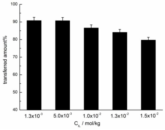 The effect of concentration of [C4AzoC2DMEA]Br on its transfer efficiency was investigated in detail, and the results were shown in Figure 3. It is shown that in the investigated concentration range (from 1.3 × 10−3 to 1.5 × 10−2 mol/kg), the transfer efficiency of [C4AzoC2DMEA]Br increased with the decrease of the concentration. This trend means that a high concentration of the IL surfactant is not beneficial for the transfer from the organic phase to water phase. Moreover, the solubility of the azobenzene-based IL surfactants in water was determined by a spectrophotometric method at 25.0 °C, and the results were shown in Table S1 in supporting information. It was shown that solubility of these ionic liquid surfactants was much higher than the concentration of the ionic liquid surfactants transferred from the organic phase to water phase. Therefore, the transfer of azobenzene-based IL surfactants from the organic phase to water was not controlled by the solubility of them.