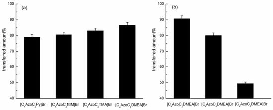 Furthermore, the chemical structure of the azobenzene-based IL surfactants on the transfer efficiency was also investigated, and the results were shown in Figure 4. It can be seen that the transfer efficiency of the IL surfactants decreased in the order: [C4AzoC2DMEA]Br > [C4AzoC2TMA]Br > [C4AzoC2MIM]Br > [C4AzoC2Py]Br; and [C4AzoC2DMEA]Br > [C4AzoC4DMEA]Br > [C4AzoC6DMEA]Br. From the viewpoint of chemical structure, [C4AzoC2DMEA]Br, [C4AzoC2TMA]Br, [C4AzoC2Py]Br and [C4AzoC2MIM]Br have different head groups of the cations, while [C4AzoC2DMEA]Br, [C4AzoC4DMEA]Br and [C4AzoC6DMEA]Br have different alkyl spacer lengths between the azobenzene group and head group. Therefore, by using the above transfer efficiency data, the effect of alkyl spacer length and head group type on the transfer efficiency could be examined. The IL surfactant has a relatively hydrophobic head group (1-methylimidazole or pyridine) or a longer alkyl spacer length of the cation is not benefit for its transfer between the organic phase and water phase.