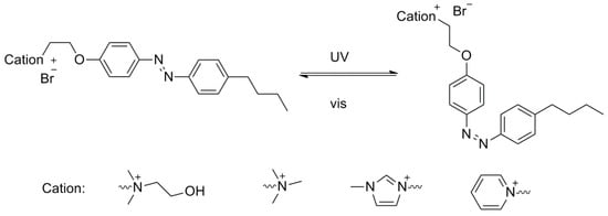 - Li, Z.; Yuan, X.; Feng, Y.; Chen, Y.; Zhao, Y.; Wang, H.; Xu, Q.; Wang, J. A reversible conductivity modulation of azobenzene-based ionic liquids in aqueous solutions using UV/vis light. Phys. Chem. Chem. Phys. 2018, 20, 12808–12816. [Google Scholar] [CrossRef] [PubMed]