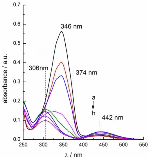 As shown in Figure 6, the maximum absorption peak at 346 nm originates from the π→π* transition of trans-isomer. Upon continuous UV light irradiation, the absorbance intensity at 346 nm gradually decreased and finally disappeared, indicating the disappearance of trans-isomer in the system. Meanwhile, two new absorption peaks came out at 306 and 442 nm, which were resulted from the π→π* and n→π* transition of cis-isomer, respectively []. Similar experimental results were also obtained from Figures S9–S14 in the supporting information. After UV irradiation, minimal absorption of cis-form at 374 nm was precisely between the peaks at 306 and 442 nm. Zakrevskyy et al. [] assumed that the initial state is pure trans-isomer [,] before irradiation and cis-isomer at 374 nm is negligible; thus, the absorbance at 374 nm could be used to calculate the content of trans-isomers after the isomerization. Thus, the equilibrium isomerization efficiencies of them were listed in Table 2.