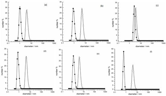 DLS results of 5.00 × 10−3 mol/kg azobenzene-based IL surfactants in aqueous solution at 25.0 °C: (a) [C4AzoC2DMEA]Br; (b) [C4AzoC4DMEA]Br; (c) [C4AzoC6DMEA]Br; (d) [C4AzoC2TMA]Br; (e) [C4AzoC2MIM]Br; (f) [C4AzoC2Py]Br; ○, before UV irradiation; ●, after UV irradiation.