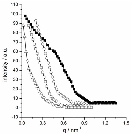 SAXS data for 5.0 × 10−3 mol/kg IL surfactants in aqueous solution at 25.0 °C: ○, [C4AzoC2DMEA]Br before UV irradiation; △, [C4AzoC4DMEA]Br before UV irradiation; □, [C4AzoC6DMEA]Br before UV irradiation; ■, [C4AzoC6DMEA]Br after UV irradiation.