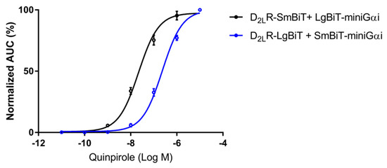For the development of a complementation-based GPCR dimer targeting strategy, the D2LR was C-terminally fused to the small 1 kDa subunit (Small BiT, SmBiT) and to the large 18 kDa subunit (Large BiT, LgBiT) of NanoLuciferase. Upon interaction with D2LR monomers, the NanoLuciferase subunits were brought into close proximity and re-assembled spontaneously into a functional protein. To ensure that these modified D2LR fusion constructs retained functionality, we performed a G-protein coupling assay. We therefore cloned the mini-Gαi protein, corresponding to the engineered GTPase domain of the Gαi subunit fusion proteins, into the NanoBiT vectors with either LgBiT or SmBiT at their N-terminus. These mini-Gαi fusion proteins were transiently co-expressed with the corresponding (complementary) D2LR fusion constructs in HEK293T cells that were stimulated with the dopamine D2R agonist quinpirole (0.01 nM–10 µM). N-terminally tagged mini-Gαi proteins showed a concentration-dependent recruitment to the D2LR–SmBiT and D2LR–LgBiT fusion constructs (Figure 1). This demonstrated (i) that both receptor fusion constructs were expressed at the cell surface, (ii) that both receptor fusion constructs were responsive to ligand-induced activation, and (iii) that both receptor fusion constructs could still undergo a conformational change upon receptor modulation. Interestingly, the different construct combinations resulted in a dissimilar output in terms of sensitivity and signal-to-noise ratio, as published previously for the G-protein coupling assay with D2R [49]. Accordingly, pEC50 values for D2LR–LgBiT and SmBiT–mini-Gαi in comparison with D2LR–SmBiT and LgBiT–mini-Gαi deviated substantially (pEC50: 6.62 ± 0.02 and 7.65 ± 0.05, respectively). Although both D2LR fusion proteins can recruit mini-Gαi in a concentration-dependent manner and, thus, are functional, these observations further underscored the importance of testing several construct combinations when implementing systems like this for deducing EC50 values.