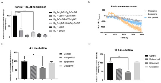 Firstly, to exclude that the observed effect was a result of possible artifacts such as toxicity, the possible influence of spiperone on the activity of native NanoLuciferase, transiently expressed in HEK293T cells, was investigated. Cells expressing the native luminescent enzyme were incubated for different time points with 10 µM of the antagonists. No impact on luciferase activity was observed (Supplementary Materials, Figure S3).
